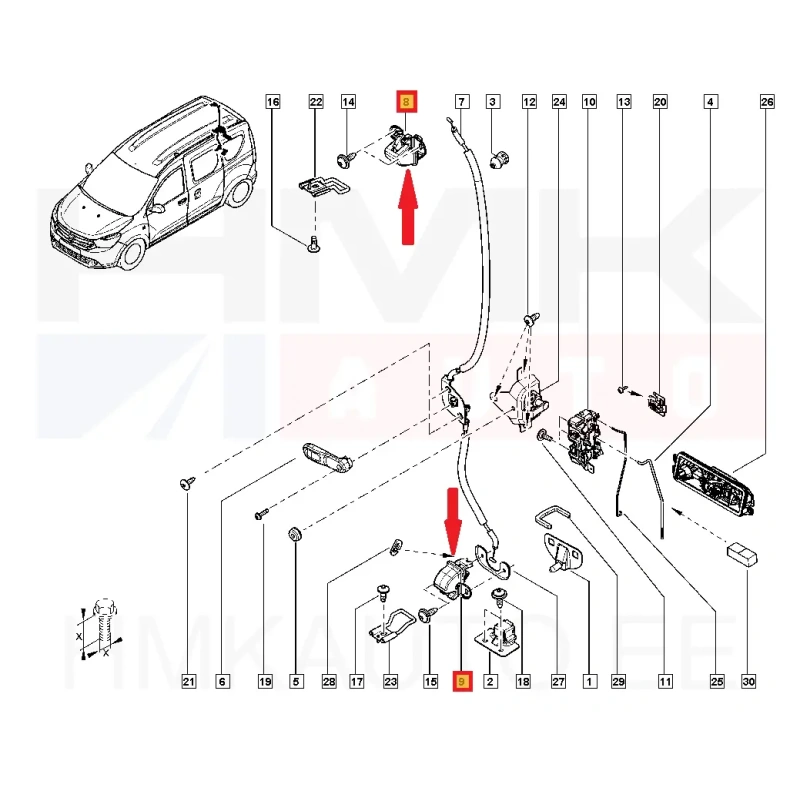 Serrure de porte arrière droite supérieur/inférieur OEM Dacia Dokker